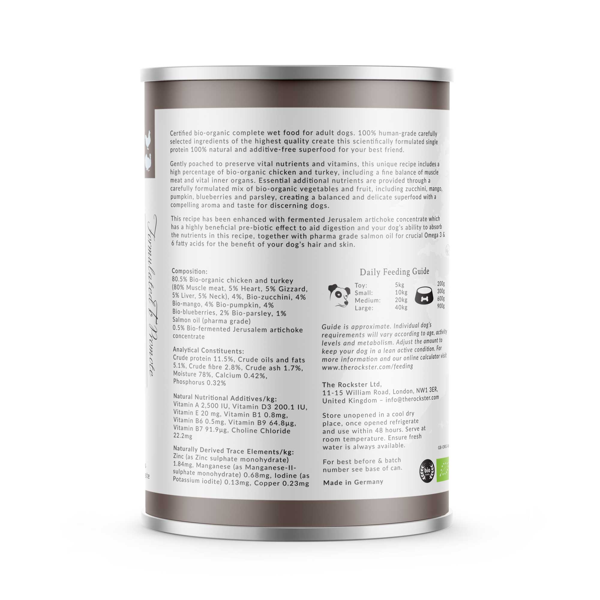 Certified bio-organic complete wet food for adult dogs. 100% human-grade carefully selected ingredients of the highest quality create this scientifically formulated single protein, additive-free superfood for your best friend. Gently poached to preserve vital nutrients and vitamins, this unique recipe includes 80.5% bio-organic chicken and turkey, using a fine balance of only muscle meat and vital inner organs. Essential additional nutrients are provided through a carefully formulated mix of bio-organic superfoods, including courgette, mango, pumpkin, blueberries and parsley, creating a balanced and delicate superfood with a compelling aroma and taste for discerning dogs. This recipe has been enhanced with fermented Jerusalem artichoke concentrate, which has a highly beneficial pre-biotic effect to aid digestion and your dog’s ability to absorb the nutrients in this recipe, together with bio-salmon oil for Omega 3 & 6 fatty acids for to support your dog’s hair and skin.