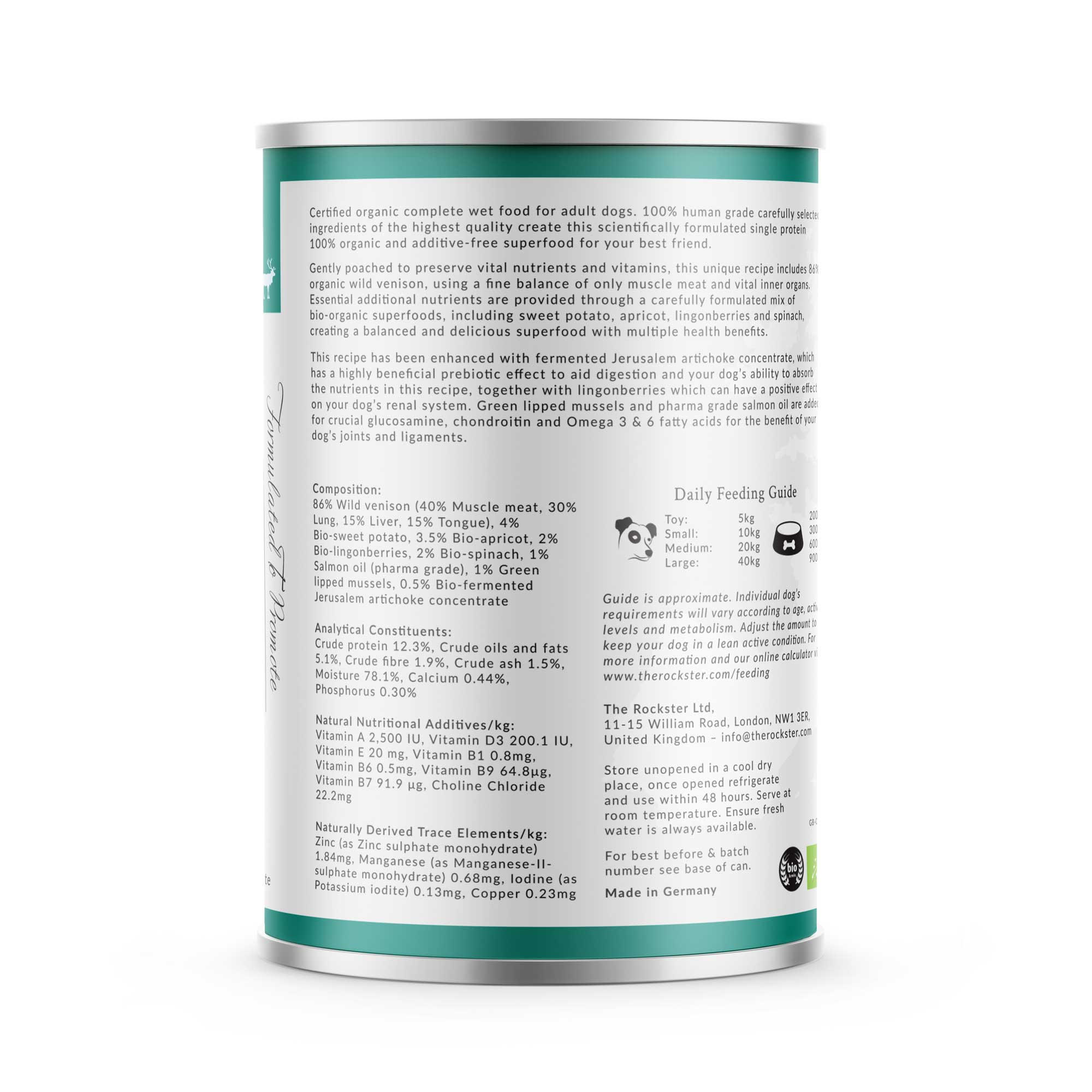 Beyond natural complete wet food for all dog breeds, using carefully selected human grade and non-GMO ingredients of the highest quality that are fit for royalty. This scientifically formulated single protein recipe uses natural nutrition to create a nutritionally balanced superfood for very special dogs. Gently steamed from raw in the can to preserve vital nutrients and vitamins, Rockster’s unique recipe includes a fine balance of 86% wild venison muscle meat and vital inner organs. Essential nutrients and antioxidants are provided through a carefully formulated mix of organic and nutritionally dense ingredients, including sweet potato, apricot and spinach, creating a balanced and delicious superfood with a compelling taste for discerning dogs. Salmon oil and New Zealand green mussels aid in this recipe‘s optimal Omega 6:3 ratio, assisting with anti-inflammatory activity. Lingonberries are an extraordinary natural source of antioxidants. The nutrients in this recipe aid musculoskeletal, cellular, metabolic and immune support. As with all of our recipes, inulin from fermented Jerusalem artichoke concentrate is added as a natural prebiotic. Created originally for a magical street dog rescued from Napoli, Rockster is the epitome of life-enhancing nutrition that will rock your dog’s world too.